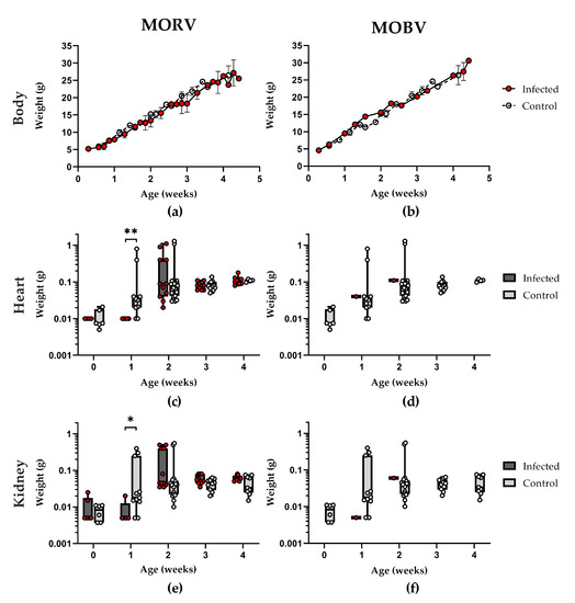 Growth and development of infected Mastomys. Data for the MORV-infected animals (inoculated subcutaneously (s.c.) with 1000 focus forming units (FFU) on days 2, 6, and 14 as well as naturally exposed) are shown on the left, and data for the MOBV-infected animals (inoculated s.c. with 1000 FFU on day 2) are shown on the right. (a,b) Body weight, as well as organ weight for hearts (c,d) and kidneys (e,f) have been measured during the first four (MORV) or two (MOBV) weeks of life. The infected individuals are depicted by red dots, whereas the uninfected control group is depicted by white dots. The body weight is depicted as mean with SD, and organ weights are shown as box and whiskers with all data points plotted. Statistical differences in weight are indicated by * p < 0.05 and ** p < 0.01, as determined by the Mann–Whitney test.