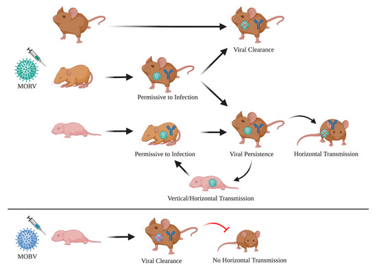 Schematic summary of the findings. Susceptibility of Mastomys to MORV infections is age-dependent. Neonates are permissive to the infection, can become chronically infected and transmit the virus horizontally, leading to more chronically infected animals. Adults and weaned individuals are permissive to the infection with MORV but clear the virus within a few weeks. Infected juveniles show a mixed phenotype with some individuals remaining long-term infected and some clearing the virus, although at a slower rate compared to adults. All animals that are in contact with the virus develop IgG antibodies, independent of their infection status. MOBV-inoculated neonatal Mastomys, on the other hand, show only transient viremia, clear the virus rapidly and are unable to transmit the virus. The figure was created by BioRender.com.
