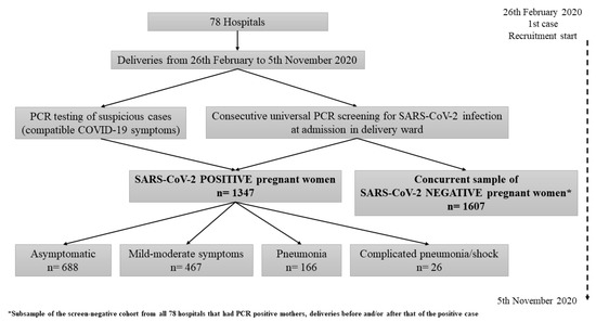 This was a multicenter prospective study of a cohort of SARS-CoV-2-infected pregnant women registered consecutively by the SOEG in 78 hospitals (Supplementary Materials Table S1) [8]. All procedures were approved by the Drug Research and Clinical Research Ethics Committee of Puerta de Hierro University Hospital (Madrid, Spain) on 23 March 2020 (protocol registration number, 55/20). Each collaborating center subsequently obtained protocol approval locally (ethics committees of the participant hospitals listed in the Supplementary Materials Table S1). The registry protocol is available on ClinicalTrials.gov, identifier: NCT04558996. Upon recruitment, mothers consented to participate in the study by either signing a document when possible, or by giving permission verbally, which was recorded in the patient’s chart in the electronic clinical recording system. Ethics committees approved the possibility of verbal consent during the first three months of the pandemic given the contagiousness of the disease and the lack of personal protection equipment. Afterwards, written consent (using the patient consent form) was collected from every patient who had previously given permission verbally.