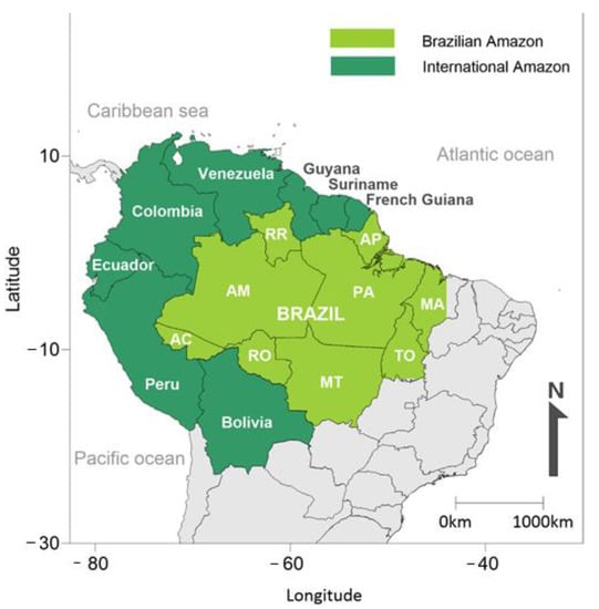 The Amazon rainforest extends over nine countries in South America (Brazil, Bolivia, Peru, Ecuador, Colombia, Venezuela, Guyana, French Guiana and Suriname). Around 60% of this tropical area is referred to as the Brazilian Amazon. Nine Brazilian states are part of this tropical region: Acre (AC), Amapá (AP), Amazonas (AM), Mato Grosso (MT), Maranhão (MA), Pará (PA), Rondônia (RO), Roraima (RR) and Tocantins (TO).