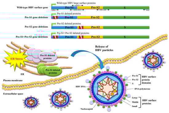 Schematic representation of HBV pre-S gene deletions and the expression and ER retention of pre-S deleted proteins. The HBV surface gene consists of three gene segments (pre-S1, pre-S2, and S) and expresses three different sizes of surface proteins (small, middle, and large) that are, respectively, composed of domains encoded from the S segment, the pre-S2 and S segments, and all three gene segments, collectively constituting the envelope proteins of viral particles. The numbers shown above and below the wild-type surface gene indicate the nt positions of each intact gene segment in the circular HBV DNA genome, which starts at nt 1 and ends at nt 3221 in a clockwise direction. Deletion mutations (indicated as red rectangle boxes with a lightning symbol) that occur solely in the pre-S1 or pre-S2 gene segment lead to the expression of pre-S1 or pre-S2 deletion mutants of large surface proteins, respectively. Unlike wild-type large surface proteins that are released as constituents of the envelope proteins of HBV particles from host cells, both pre-S1 and pre-S2 deleted proteins are mainly retained in the host cell organelle ER and induce ER stress. In addition, deletion mutations that occur concurrently in the pre-S1 and pre-S2 gene segments (the so-called pre-S1 + pre-S2 gene deletions) may lead to the expression of large surface proteins harboring both pre-S1 and pre-S2 deletions (the so-called pre-S1 + pre-S2 deleted proteins), which may act in a manner like pre-S1 and pre-S2 deleted proteins—although the exact molecular function remains to be clarified. The HBV DNA polymerase associated with the viral DNA genome and the nucleocapsid encompassing the viral DNA genome are also shown in the diagram. Abbreviations: HBV, hepatitis B virus; ER, endoplasmic reticulum.