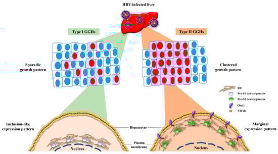 Schematic representation of the growth patterns of GGHs and the expression patterns of HBV pre-S deleted proteins. In the liver tissues of patients with chronic HBV infection, two distinct types of GGHs (type I and type II) are identified as HBV-infected hepatocytes that express pre-S1 and pre-S2 deleted proteins, respectively. Type I GGHs display a scattered or sporadic growth pattern and express pre-S1 deleted proteins in a globular or inclusion-like pattern due to the accumulation of pre-S1 deleted proteins in the ER, whereas type II GGHs display a clustered growth pattern and express pre-S2 deleted proteins in a marginal pattern due to the accumulation of pre-S2 deleted proteins in the ER followed by STIM1-and Orai1-mediated connection of the ER and plasma membrane. Abbreviations: HBV, hepatitis B virus; GGHs, ground glass hepatocytes; ER, endoplasmic reticulum; STIM1, stromal interaction molecule 1; Orai1, calcium release-activated calcium modulator 1.