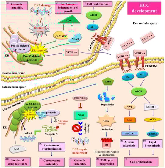 Schematic summary of signaling pathways activated by HBV pre-S deleted proteins and their implications in HCC development. In chronic HBV infection, both pre-S1 and pre-S2 deleted proteins accumulate in the ER and induce ER stress in hepatocytes (as highlighted by (1)). Through the mediation of ER stress, both types of pre-S deleted proteins can initiate three oncogenic signaling pathways, one involving oxidative stress to induce DNA damage and genomic instability (as highlighted by (2)), another involving NF-κB/p38 MAPK/COX-2 to enhance anchorage-independent cell growth (as highlighted by (3)), and the other involving VEGF-A/VEGFR-2/Akt/mTOR to promote cell proliferation (as highlighted by (4)). Through the mediation of mTOR activation, pre-S deleted proteins can further initiate two metabolism-related signaling pathways; one involving YY1/Myc/SLC2A1 to stimulate aerobic glycolysis (as highlighted by (5)) and the other involving SREBF1/ACLY/FADS2 to increase lipid biosynthesis (as highlighted by (6)), collectively contributing to cell proliferation. Furthermore, pre-S2 deleted proteins can additionally initiate four ER stress-dependent or -independent signaling pathways: one involving Ca2+/μ-calpain/ΔN-cyclin A to induce centrosome overduplication and chromosome instability (as highlighted by (7)), one involving JAB1/p27/Cdk2/Rb to promote cell cycle progression (as highlighted by (8)), one involving importin α1/NBS1 to inhibit DNA repair (as highlighted by (9)), and the other involving Bcl-2 to enhance cell survival and drug resistance (as highlighted by (10)). The combined effects of pre-S deleted proteins on DNA damage and genomic instability, anchorage-independent growth and proliferation, aerobic glycolysis and lipid biosynthesis, centrosome overduplication and chromosome instability, cell cycle progression, and cell survival result in HCC development. Abbreviations: HBV, hepatitis B virus; ER, endoplasmic reticulum; NF-κB, nuclear factor-κB; p38 MAPK, p38 mitogen-activated protein kinase; COX-2, cyclooxygenase-2; VEGF-A, vascular endothelial growth factor-A; VEGFR-2, vascular endothelial growth factor receptor-2; Akt, protein kinase B; mTOR, mammalian target of rapamycin; YY1, Yin Yang 1; SLC2A1, solute carrier family 2 (facilitated glucose transporter) member 1; SREBF1, sterol regulatory element-binding transcription factor 1; ACLY, adenosine triphosphate citrate lyase; FADS2, fatty acid desaturase 2; Ca2+, calcium; ΔN-cyclin A, N-terminus truncated cyclin A; JAB1, Jun activation domain-binding protein 1; Cdk2, cyclin-dependent kinase 2; Rb, retinoblastoma protein; NBS1, Nijmegen breakage syndrome 1; Bcl-2, B cell lymphoma-2; HCC, hepatocellular carcinoma.