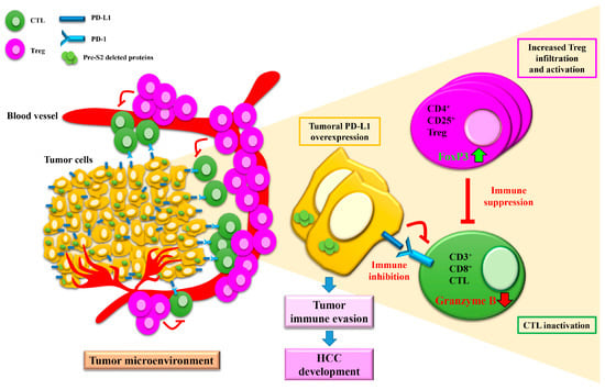 Most recently, Teng et al. showed that HCC patients with pre-S2 gene deletions in the blood displayed higher numbers and activity levels of “pro-tumor” regulatory T cells (Tregs), similar numbers but lower activity levels of the “anti-tumor” cytotoxic T cells (CTLs), and higher expression levels of immune checkpoint molecule programmed death ligand 1 (PD-L1) but similar expression levels of its receptor programmed death 1 (PD-1) in tumor tissues than patients without did, suggesting a possible role of pre-S2 deleted proteins in the regulation of the tumor immune microenvironment in HBV-related HCC, although the exact mechanisms remain to be clarified (Figure 5) [,]. Considering that increased Tregs and decreased CTLs in number and activity in tumor tissues have been shown to promote tumor immune evasion and are associated with poor outcomes in HCC patients [], suppressing Tregs or enhancing CTLs in number or activity in the tumor microenvironment may be a promising strategy for treating HCC patients who are positive for pre-S2 deleted proteins. Moreover, it has been shown that high PD-L1 expression in tumor tissues is correlated with a poor prognosis in HCC patients [,,] and predicts a better response to PD-L1-based therapy in cancer patients []. Immune checkpoint inhibitors targeting PD-L1 may also hold promise as potential therapeutics for HCC patients with pre-S2 gene deletions.