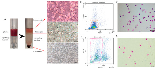 Grass carp were purchased from a fish farm in Huanggang City (Hubei Province, China), weighing 25 g–30 g, and was temporarily raised in the recirculating freshwater system at 28 ± 1 °C for more than two weeks. They were fed twice a day with a commercial pellet diet at a rate of 2% body weight. 3-aminobenzoic acid ethyl ester methanesulfonate (MS-222) (Sigma-Aldrich Co., St. Louis, MO, USA) was used to anesthetize grass carp by bath immersion for 2–5 min, then the blood samples (0.5 mL) were collected by venipuncture from the caudal with a syringe of 1% heparin wetting. About 5 mL blood samples of 10 grass carp were collected each time, and peripheral blood erythrocytes, leukocytes, and thrombocytes were isolated by used a fish peripheral blood platelets separation kit (Solarbio, Beijing, China).
