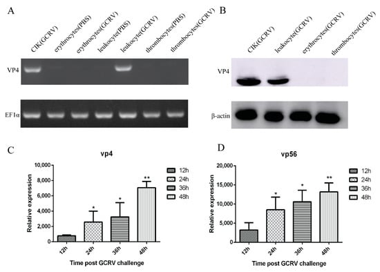 After grass carp reovirus II (GCRV-II) infection, leukocytes, thrombocytes, erythrocytes, and C. idella kidney (CIK) cells were detected. (A) PCR results showed that leukocytes and CIK cells detected GCRV-positive with VP4 primer and EF1α as an internal reference, but erythrocytes and thrombocytes detected GCRV-negative. (B) Western blot results showed that with VP4 polyclonal antibody as primary antibody and β-actin as an internal reference, leukocytes and CIK cells detected GCRV-positive after infection, but erythrocytes and thrombocytes detected GCRV-negative. (C,D) Quantitative primers of VP4 and VP56 were used for qRT-PCR detection, respectively. The viral load of GCRV at 12 h, 24 h, 36 h, and 48 h after GCRV infection was detected, the control group was 0h after GCRV infection. Data of reporter assays and qPCR are shown as mean ± standard deviation (SD) of 6 wells of cell per group and are from one experiment representative of three independent experiments. Significance was calculated in relation to the control group. * p < 0.05, ** p < 0.01 (two tailed Student’s t-tests). The relative transcription levels were normalized to the transcription level of EF1α gene and are represented as fold induction relative to the transcription level in control cells, which was set to 1.