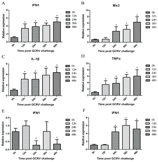 Leukocytic antiviral responses to GCRV-II infection. Expression of genes involved in antiviral responses was measured by qRT-PCR, use EF1α as an internal reference gene. The expression levels in infected leukocytes in 6-well plates were challenged with GCRV for 0 h, 12 h, 24 h, 36 h, and 48 h. The relative increase for IFN1 (A), Mx2 (B), IL-1β (C), and TNFα (D) is shown. (E) The expression levels of IFN1 in infected erythrocytes in 6-well plates were challenged with GCRV for 0 h, 12 h, 24 h, 36 h, and 48 h. (F) The expression levels of IFN1 in infected thrombocytes in 6-well plates were challenged with GCRV for 0 h, 12 h, 24 h, 36 h, and 48 h. Data of reporter assays and qPCR are shown as mean ± SD of 6 wells of cell per group and are from one experiment representative of three independent experiments. Significance was calculated in relation to the control group. * p < 0.05 (two tailed Student’s t-tests). The relative transcription levels were normalized to the transcription level of EF1α gene and are represented as fold induction relative to the transcription level in control cells, which was set to 1.