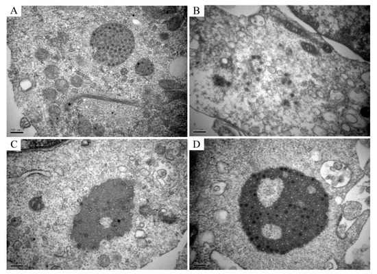Several different morphogenesis of GCRV-II in CIK cells. (A) Mature virions arranged neatly like a lattice, with a diameter of about 70–80 nm; (B) Scattered virions, released in the cytoplasm, with a diameter of about 70–80 nm; (C) Early virus inclusion bodies are relatively dense and contain a small number of virions, which are in the process of forming; (D) Late VIBs, which are thick and have a large number of virions, are in the process of generating.