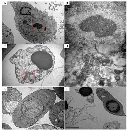 Transmission electron microscope observation of leukocytes, erythrocytes, and thrombocytes after infection with GCRV-II virus. (A,B) are the virus inclusion bodies (VIBs) in CIK cells infected with the virus. The structure is dense and contains a large number of virions in the process of being formed, without apparent membrane structure outside; (C,D) are virions in infected leukocytes that exist in the cytoplasm in the form of a relatively obvious envelope structure, which envelops a large number of virions, and the interior is not dense, showing a vacuole structure; (E) and (F) are respectively infected erythrocytes and thrombocytes, both cells have no noticeable pathological changes, and their constructions are complete.