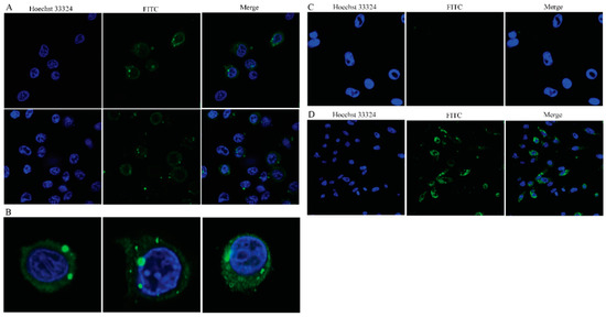 GCRV-positive leukocytes were identified by immunofluorescence microscopy by granular staining in the cytoplasm, confocal microscopy of different staining patterns in the cytoplasm, including a few inclusions and scattered granular staining in the perinuclear region (Figure 6A,B). Immunofluorescence microscopy results showed that erythrocytes were GCRV-negative. No fluorescent particles were found in the cytoplasm of the erythrocytes, only the nuclei showed blue fluorescence, indicating that no virus particles were detected in the infected erythrocytes (Figure 6C). Indirect immunofluorescence results showed that CIK cells were GCRV-positive. A mass of virions were detected in the CIK cytoplasm after infection, containing inclusions that varied in size and number from a few large inclusions to multiple more minor inclusions in the perinuclear region, or diffuse granular staining throughout the cytoplasm (Figure 6D).