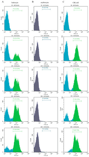 GCRV-positive leukocytes, GCRV-negative erythrocytes and GCRV-positive CIK cells were detected by flow cytometry. The proportion of positive (green) and negative (blue) GCRV infections was measured by flow cytometry at 0 h, 12 h, 24 h, 36 h, and 48 h after GCRV infection. In ex vivo infected leukocytes, GCRV-positive rates were 0.32%, 23.47%, 33.02%, 45.95%, 64.60% at 0 h, 12 h, 24 h, 36 h, and 48 h, respectively. This result indicated that with the increase of infection time, the number of positive cells also increased, and the overall positive rate of GCRV leukocytes also increased (Figure 7A). In ex vivo infected erythrocytes, GCRV-positive rates were 0.01%, 0.64%, 0.38%, 0.45%, 1.04% at 0 h, 12 h, 24 h, 36 h, and 48 h, respectively. This result indicated that with the duration of infection time, the positive rate of GCRV did not change significantly, indicating that GCRV could not infect erythrocytes in vitro (Figure 7B). In infected CIK cells, GCRV-positive rates were 0.24%, 38.85%, 43.96%, 64.35%, 86.78% at 0 h, 12 h, 24 h, 36 h, and 48 h, respectively. This result indicated that with the increase of infection time, the positive rate of GCRV increased, and the positive rate was all higher than that of leukocytes. It is suggested that GCRV could infect CIK cells, and CIK cells were more likely to infect GCRV than leukocytes (Figure 7C).