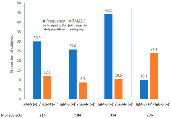 Proportion of subjects with SARS-CoV-2 shedding (TMA+) according to type of serological response and targeted antigens. S, spike protein; N, nucleocapsid protein. (1) IgM-S and IgG-N were done by chemiluminescence immunoassay method in the Abbott® Architect® platform. (2) IgG-S tests were done by rapid lateral flow immunochromatography by Autobio®. Transcription-mediated amplification (TMA) was done by Panther®, Hologic-Grifols®. N, nucleocapsid; S, spike.