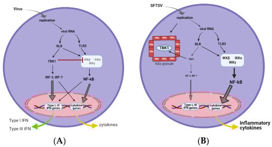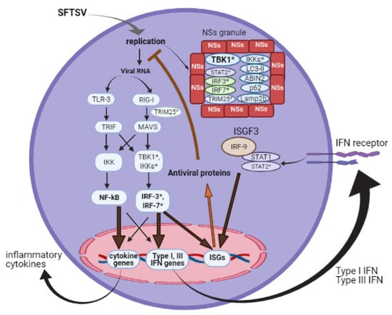 NSs expression in vitro, in conjugation with double-stranded RNA or the virus-induced signal, augmented the induction of pro- and anti-inflammatory cytokines, a response reminiscent of a cytokine storm [32,33], suggesting that SFTSV induces the cytokine storm through NSs [32]. It has been recently shown that NF-κB may be the primary transcription factor mediating the NSs-induced cytokine upregulation and that controlling NF-κB activity may be a therapeutic approach to treat SFTS [32]. The study revealed that TBK1 has intrinsic inhibitory activity for IKKβ, a component of the IKK complex. Genetic deletion or the pharmacological inhibition of TBK1 resulted in the hyper-activation of NF-κB. Because NSs is a strong inhibitor of TBK1, its expression resulted in the release of NF-κB from TBK1 suppression. The function of NSs in IFN response suppression and hyper-inflammation is summarized in Figure 2. Studies in vivo and in vitro have highlighted TBK1 as a critical regulator of the anti-viral and inflammatory responses upon SFTSV infection. These results suggest the suppression of NF-κB as a promising therapy for SFTS [10,32].