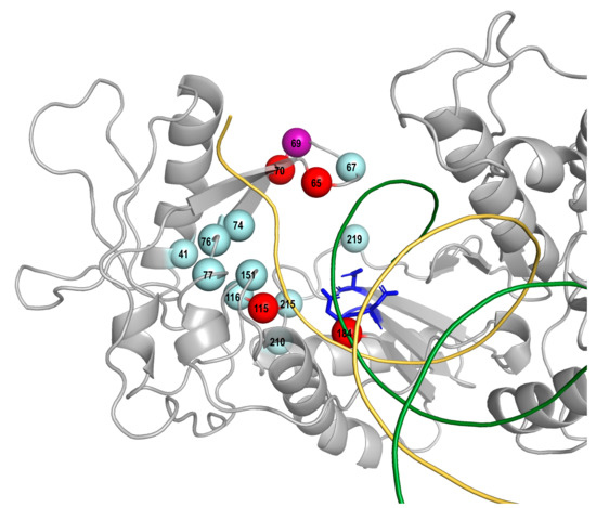 Three-dimensional structure (PDB accession number 1RTD) of HIV-1 RT showing the p66 monomer in grey. The active site residues D110, D185 and D186 are shown in stick mode in blue, a DNA template and a primer are shown in ribbon mode in yellow and green, respectively. Red spheres indicate four SDRM positions at which SDRMs including K65R, K70E, Y115F, and M184V/I and tenofovir-associated non-SDRMs (K70Q/T) increased in prevalence since 2009 in NRTI-experienced persons. A purple sphere indicates a SDRM position at which tenofovir-associated non-SDRM T69deletion increased in prevalence since 2009 in NRTI-experienced persons. Spheres in cyan indicate SDRM positions at which SDRMs decreased or did not change in prevalence since 2009 in NRTI-experienced persons.