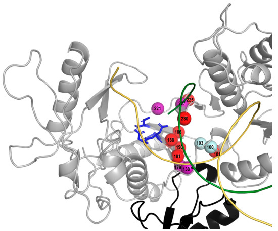 Three-dimensional structure (PDB accession number 1RTD) of HIV-1 RT showing the p66 monomer in grey and the finger domain of the p51 in black. The active site residues D110, D185, and D186 are shown in stick mode in blue, a DNA template and a primer are shown in ribbon mode in yellow and green, respectively. Red spheres indicate seven SDRM positions at which SDRMs including K101E, Y181V, Y188C, G190S, P225H, and M230L increased in prevalence since 2009 in NNRTI-experienced persons. Four spheres in purple indicate positions at which non-SDRMs (E138K/Q, V179L, H221Y, and F227C/L) increased in prevalence since 2009 in NNRTI-experienced persons. Spheres in cyan indicate two SDRM positions at which SDRMs decreased or did not change in prevalence since 2009 in NNRTI-experienced persons.