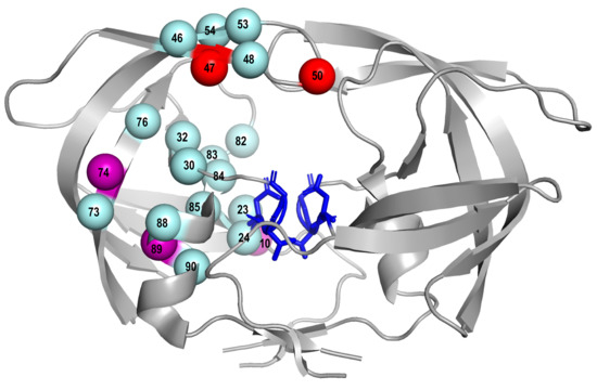 Three of the mutations were on four expert lists including L10F, T74P, and L89V. T74P and L89V were considered to be accessory mutations based on analyses of phenotypic and clinical data derived from the POWER studies that led the FDA approval of darunavir [22]. L10F has been shown to be an accessory DRM associated with reduced in vitro lopinavir and darunavir susceptibility [23,24,25]. The addition of these three mutations the current list of PI-SDRMs would have increased the prevalence of PI-associated TDR by a median of 0.3% (range: 0 to 0.5%) in the representative sample of 10 recent TDR studies (Table S5). Figure 3 shows the locations of the PI-SDRMs and the three candidate mutations (L10F, T74P, and L89V) within the three-dimensional structure of HIV-1 protease.