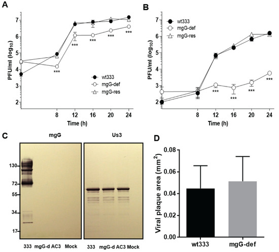 Biological activities of the mgG deficient HSV-2. One-step growth kinetics of the HSV-2 strain 333 (wt333), the mgG deficient recombinant virus (mgG-def), and the mgG-proficient (mgG-res) recombinant virus production in cells (A) and in infectious culture supernatant (B) of GMK AH1 cells. Values shown are means (±SD) of data from two separate experiments performed in duplicates. Statistically significant differences as related to wt333 at p values of <0.005 (***). (C) Expression of Us3 protein kinase by the mgG deficient HSV-2. Lysates of GMK AH1 cells infected with wt333 or the mgG deficient HSV-2 mutant viruses mgG-def (mgG-d) or 333 + AC3gG (AC3) were electrophoresed under reducing conditions on a 4–12% NuPAGE Bis-Tris precast gel and electroblotted into PVDF. Viral mgG and Us3 components were detected using monoclonal anti-mgG antibody O1C5 and rat polyclonal anti-Us3 serum respectively. (D) Areas of plaques formed by wt333 and the mgG-def mutant virus. The results are shown as the mean size (±SD) of 67 viral plaques captured at 48 h after infection of GMK AH1 cells from six different microscope fields.