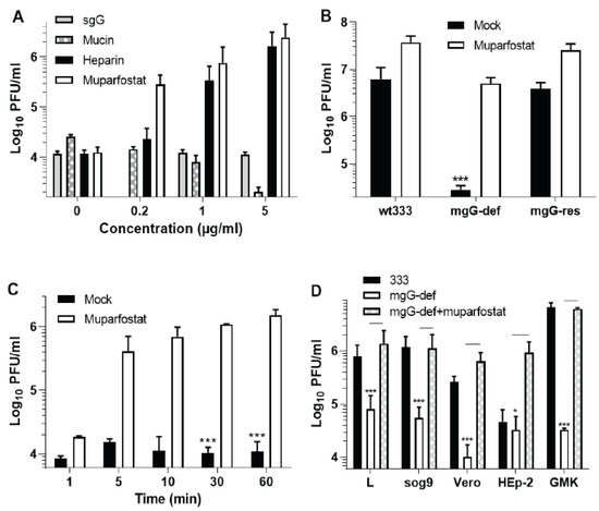 Knowing that the mgG-def virions are present on the surface of infected cells (Figure 2B), we attempted to forcibly liberate infectious virus by treatment of cells with the following agents: (i) Secreted fragment of gG (sgG) because gG of HSV-2 apart from the virion-associated mgG also comprises sgG that is secreted from infected cells into the medium [19]; (ii) mucin from bovine submaxillary glands because mgG comprises an extensive mucin-like region, and (iii) GAGs or their mimetics such as sulfated oligosaccharide muparfostat or sulfated polysaccharide heparin which are known to compete with cell surface GAG chains of HS and CS for binding sites in HSV attachment proteins [16]. After infection of cells for 2 h at 37 °C, the inoculum was carefully removed and the cells were rinsed and incubated in medium supplemented with these agents for further 22 h, that is, until the development of complete cytopathic effect. Only the GAG-mimicking compounds liberated substantial amounts of infectious virus (Figure 4A). Although the mgG-def virus is known to be relatively resistant to muparfostat and heparin, which was manifested as ~10 fold decreased sensitivity to these compounds as compared to wt333 [16], incubation of cells with muparfostat and heparin (both at 5 µg/mL) substantially enhanced the level of infectious virus in supernatant culture medium (Figure 4A). Remarkably, while the level of wt333 and the mgG-res was enhanced by muparfostat ~6–7 fold, the amount of mgG-def virus in the medium was increased ~200 fold, that is, nearly to the level found with mock-treated wt333 (Figure 4B).