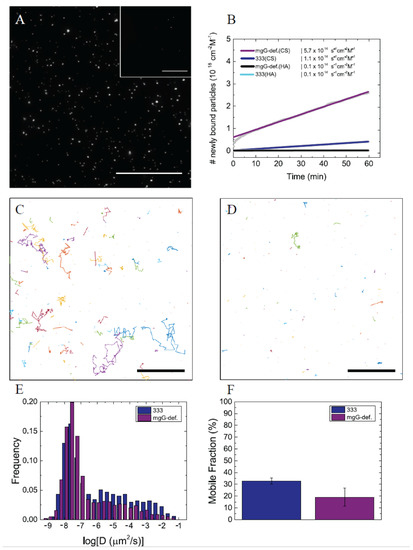 In addition to kinetic analysis, we performed single particle tracking (SPT) analysis to quantify virus particle diffusion on the CS surfaces. Visual inspection of the recorded movies revealed that a fraction of CS-bound HSV-2 particles underwent lateral diffusion as illustrated by the individual particle trajectories shown in Figure 5C,D for the wt333 and mgG-def viruses, respectively. Moreover, the wt333 (Figure 5C) appeared to show increased mobility compared to the mgG-def mutant virus (Figure 5D). To quantify this visual observation, we calculated the diffusion coefficients corresponding to the measured trajectories. Data in Figure 5E show the histograms of the calculated diffusion coefficients for both viruses. Both histograms are dominated by a peak at ~10−8 µm2/s, which we attributed to immobile particles. The non-zero value of this peak is caused by localization errors of the particles [38]. In addition, the histograms show a large tail in the distributions of D values with diffusion coefficients ranging up to ~10−1 µm2/s, which implies that a few particles can travel distances up to 40 µm during the acquisition time of 1 h. The tail distribution of wt333 particles showed higher frequencies at high D values compared to mgG-def, which is in line with our initial observation that fast diffusing wt333 particles were more numerous. To illustrate this, we further calculated for each virus the average mobile fraction, determined by the percentage of particles with D values higher than a threshold value, which we chose based on the position of the immobile peak in the histograms (see Materials and Methods section for further details). We measured a mobile fraction of 32.8 ± 2.7% for the wt333 strain and 19.1 ± 7.5% for the mgG-def mutant virus (Figure 5F), confirming increased mobility for the wt333 in comparison to the mutant virus. These data demonstrate that the mgG-def virions exhibited much more extensive binding to CS chains compared to wt333 virions, a feature that may limit their lateral diffusion. This suggests that mgG plays a role in balancing the interaction of HSV-2 particles with GAG chains.