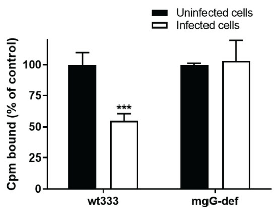 GMK AH1 cells were inoculated with the strain wt333, and 24 h later purified methyl-3H-thymidine labeled mgG deficient or wild type virions (adjusted to 1.7 × 107 DNA copies) were added and incubated with cells for 2 h at 37 °C. The results are expressed as a percentage of the number of counts per minute (cpm) bound to infected cells relative to that bound to non-infected control cells. Values shown are means (±SD) of data from two separate experiments performed in duplicates. The mean number of cpm bound to non-infected cells were 1053 and 554 for wt333 and mgG-def virions respectively. Statistically significant differences as related to uninfected cells at p values of <0.005 (***).