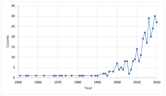Trend of mosquito-associated viruses reported in literature in West Africa.Increasing trend of mosquito-associated virus discovery and research (Count = combination of virus discoveries and researches on mosquito-associated viruses). A search at the NCBI database (https://www.ncbi.nlm.nih.gov) by entry of the syntax ‘mosquito-borne viruses, West Africa’, and ‘mosquito specific viruses, West Africa’. Last search date: 8 December 2020.