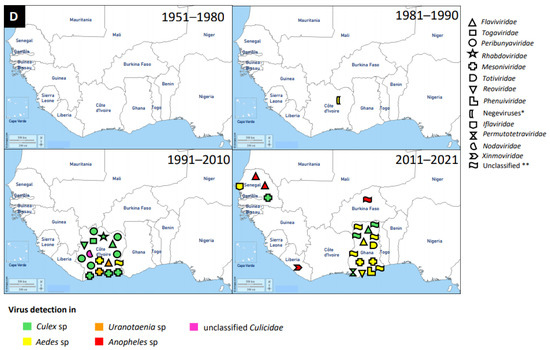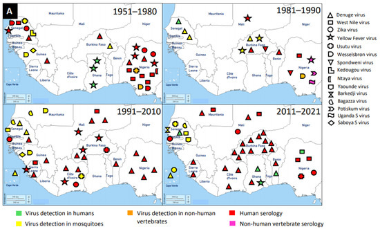 MAVs in West Africa have been reviewed in the past by a few authors who focused on the field of MBVs only [1,2,3]. However, MAVs (i.e., MSVs and MBVs) are often discovered and their continual surveillance is key to harnessing effective control and emergency preparedness. West Africa has high floristic and faunistic biodiversity characterised by a diversified vegetation (e.g., forest and savannah) and land-cover change (e.g., agricultural, rural, and urban areas), wild and domestic vertebrate animals (e.g., reptiles, birds, mammals, etc.), mosquitoes (e.g., Aedes, Anopheles, Culex, etc.), and pathogens (i.e., MSVs and MBVs) [1,2,3,25]. Biological interactions among and between MAVs, mosquitoes, and vertebrate hosts coexist and evolve across different bioclimatic ecozones (i.e., arid in Sahel savannah over drier in Sudan savannah to moderately wetter Guinean and wetter Guineo–Congolian forest) [3,25,26,27]. Moreover, the western African region is particularly experiencing devastating effects of deforestation, agricultural encroachment, rapid and unplanned urbanisation, and climate change that can influence the ecologies of MAVs, hosts, and Aedes mosquitoes [3,25,26,27,28,29,30,31,32,33]. Therefore, it is imperative to review the common MAVs in the West African region, and provide a guide for emerging and re-emerging viruses. In this review, we document the diversity, abundance, and distribution of MAVs (i.e., MSVs and MBVs) of veterinary and medical interests, and the mosquito hosts, mosquito vectors, and vertebrate hosts involved in their life cycles and transmission cycles (i.e., sylvatic or zoonotic, emergence and urban or epidemic cycles) in the region. We examined also how urbanisation, land use, and global weather change can influence the epidemiology of MAVs and MSVs and the ecology of their vectors in West Africa. The findings increase our understanding of MAVs of medically important vectors and identify key knowledge gaps. We also identify future research areas to explore in order to improve and design strategies and policy for the biosurveillance and early detection of arboviruses for the prediction and prevention of arboviral outbreaks and the biocontrol of their mosquito vectors in West Africa.