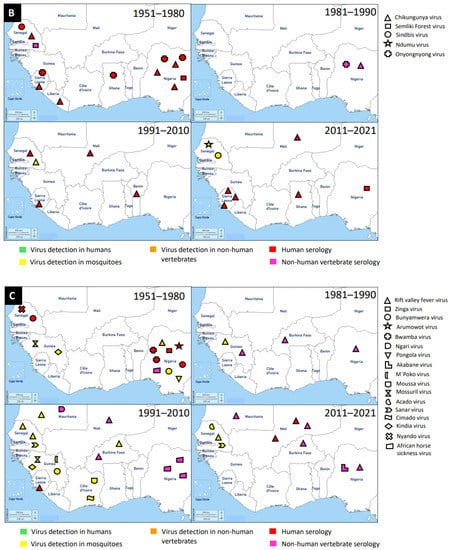 In this review we systematically compiled the available published literature on MAVs in West Africa. The search was conducted in PubMed and Google Scholar by searching the terms ‘arbovirus’, ‘mosquito-borne arboviruses’, ‘mosquito-specific viruses’; ‘arboviral disease’ AND <country name> OR ‘West Africa’. Sources included also previous reviews about arboviruses and mosquito-specific viruses in Africa and other parts of the world [1,2,3,4]. Searches were not limited by year, going back to publication in the 1950s and until April 2021. Bibliographies of selected publications were also searched for supplementary reports. English, French, and Russian reports were screened. Publications were searched for data about virus isolation from humans, vertebrates, and mosquitoes, detected by reverse transcription polymerase chain reaction (RT-PCR), virus isolation in cell culture, inoculation in laboratory animals, and plaque reduction neutralization test (PRNT), and also for detections of IgM and IgG in humans and vertebrates by enzyme-linked immunosorbent assay (ELISA), rapid diagnostic tests (RDTs) based on immunochromatographic detection, and complement fixation test (CT). If available, ´year of virus detection´ and not ´year of publication´ were assigned in Table 1.
