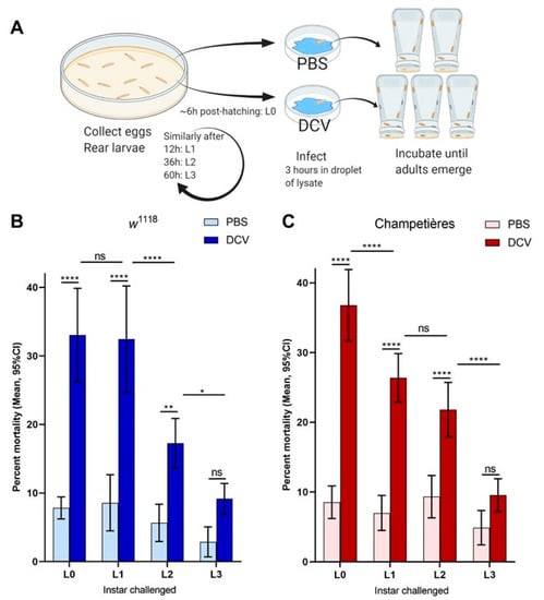 Mortality caused by DCV decreases when infection occurs later in larval development: larvae of the w1118 and Champetières fly lines were picked from rearing plates and orally challenged with lysates of DCV- or PBS-injected flies at 4 different times post ecclosion, and transferred to individual test plates (A). At least 4 biological replicates were done, each containing 2-PBS- and 3-DCV-challenged groups of larvae, per time point. Mortality was calculated from the proportion of adults that emerged from the larvae transferred to each test plate, for each PBS or DCV feeding challenge. A two-way ANOVA analysis was used to compare the effect of infection and the time (of larval development) at which the challenge was done. Using Šídák’s test for multiple comparisons, the survival between PBS and DCV at each time point was compared, to determine that L0, L2, and L2 larvae were susceptible to lethal DCV infection compared to their uninfected controls; and Tukey’s test was used to compare the mortality after PBS or DCV feeding across instars, to determine that the mortality caused by DCV decreased significantly between the L0-L1, L1-L2, and/or L2-L3 times of infection ((B,C); statistical analysis results are detailed in Table S1; * p < 0.05, ** p < 0.01, *** p < 0.001, **** p < 0.0001).