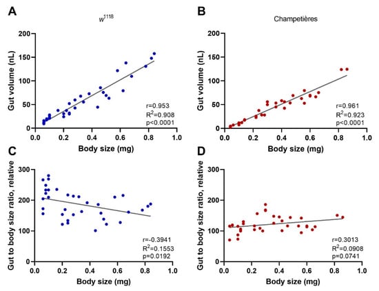 The size of the gut increases in a proportional manner to the total body size: larvae of the w1118 (blue circles: (A,C)) and Champetières (red circles: (B,D)), fly lines of different sizes and instars (L1, L2, and L3) were simultaneously selected and fed with standard solutions of FITC-dextran particles. Groups of 5 similarly sized larvae were weighed, surface cleaned, and macerated, to measure the ingested FITC content and estimate the volume of the gut. The correlation between average weight and average gut volume per group of 5 larvae was estimated using a Pearson correlation test (A,B), indicating a positive strong correlation between total body and gut size as the larvae grow. Furthermore, the gut-to-body ratio was calculated, and a Pearson test was used to evaluate its correlation to body size (C,D), indicating no correlation for Champetières, and a weak negative correlation for w1118 larvae.