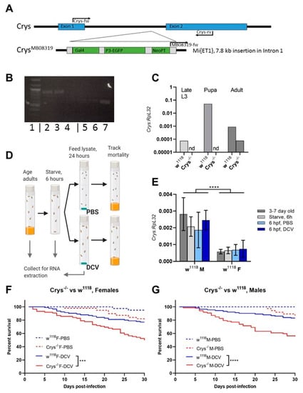 The loss of Crys increases the susceptibility to oral viral infection in adult flies: (A) the Crys−/− line originates from a 7.8 kb Minos-mediated insertion within intron 1 of the Crys gene, Mi{ET1} [61,62]. Primers for Crys used in this study were designed for differentially amplifying the Mi{ET1} insertion, the wild-type Crys gene, and cDNA obtained from processed mRNA. (B) The insertion was confirmed by conventional PCR (1: 100bp DNA ladder; 2, 3, 4: wild-type Crys gene in w1118, Champetieres, and Crys−/−, respectively; 5, 6, 7: CrysMB08319 in w1118, Champetières, and Crys−/−, respectively). (C) A decreased or total loss of mRNA expression [24] was confirmed by RT-qPCR in pools of wandering larvae, pupae, or 1-day-old adults of w1118 and Crys−/−, and ‘nd’ signifies none-detected. Relative expression of Crys to RpL32 was analysed by ΔΔCt of the estimated efficiency for each primer, each previously calculated from the dilution series of a known, positive sample. (D) Adult males and females of 3–7 days-old were briefly starved and orally challenged with PBS- or DCV-lysates mixed with sucrose, and used for RNA extractions and survival bioassays. (E) Neither the starvation nor 6 h after having initiated the oral challenge (hours post-feeding, hpf) led to significant differences in the expression of Crys mRNA of the wild-type controls [24] when analysed by a two-way ANOVA using Šídák’s multiple comparisons; however, the expression was significantly higher in males than in females at every condition. No Crys mRNA was detected in Crys−/− adults at any time point of the oral feeding setup (data not shown). (F,G) After the feeding challenge, we tracked the survival of adults for 30 days. Analysis of survival data indicates that the loss of Crys significantly increases the mortality of DCV-fed adults, after the analysis of survival curves using a Cox mixed-effects model (*** p < 0.001; **** p < 0.0001).