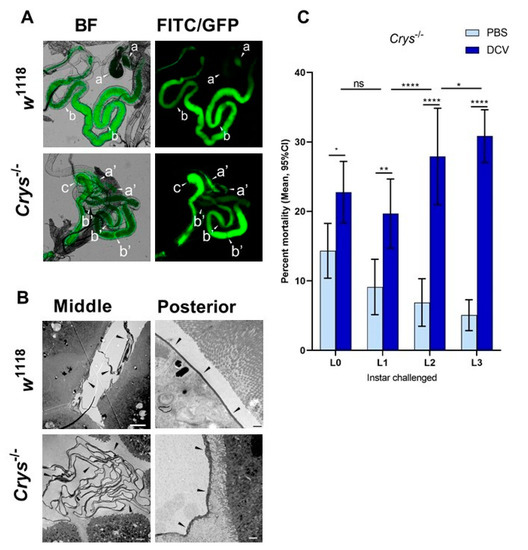 The loss of Crys increases the permeability of the larval PM, and increases the mortality of older larvae after oral DCV infection: (A) using bright field (BF) and fluorescence microscopy, the crossing of FITC-labelled DCV-sized particles out of the PM and into the gut lumen was observed more commonly in the middle midgut of Crys−/− larvae than in their w1118 counterparts (pointers a, a’). In contrast, the PM of the posterior midgut was permeable to DCV-sized particles in almost every gut analysed (pointers b, b’). The transgenic 3xP3-EGFP marker in Crys−/− larvae was observed in the same fluorescence channel used for FITC, and used to confirm the Mi{ET1} cassette insertion. The promoter of this marker is reported to be brain- and eye-specific [64]; however, it also produces a signal in the hindgut (pointer c). (B) Using TEM, we evaluated the thickness and structure of the PM (indicated by the pointers) in middle and posterior midguts of L3 larvae of w1118 and Crys−/− larvae. In Crys−/−, the PM appeared diffuse, irregular, and tended to fold and accumulate in excess in the middle midgut. Bar in w1118-middle, 5 µm; in w1118-posterior, 0.5 µm; in both Crys−/− images, 1 µm. (C) Upon oral challenge following the same protocol as in Figure 1A, we used a two-way ANOVA with Šídák’s test to compare PBS and DCV mortality at each time point. At all time points there was an increased mortality when larvae were fed with DCV lysates. Furthermore, after comparing the effect of PBS or DCV across time points using Tukey’s test, the mortality caused by DCV significantly increased when the oral challenge was done in late larvae (results of statistical analysis are detailed in Table S1; * p < 0.05, ** p < 0.01, **** p < 0.0001).