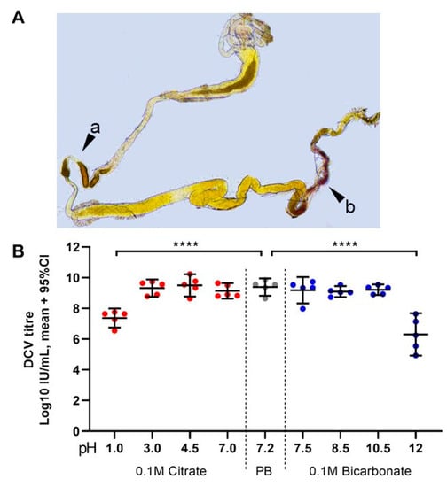 Highly acidic and highly alkaline conditions found in the midgut can affect DCV infectivity: (A) upon dissection of L1, L2, and L3 larvae, the m-cresol purple ingested shifts to a red/orange hue in the middle midgut indicating a pH between 1.2 and 2.5 (pointer a), and to a brown/purple hue towards the end of the posterior midgut, close to the Malpighian tubules, indicating a pH > 9.0 (pointer b). These colours fade towards yellow rapidly after dissection, as the gut is neutralised when exposed to the glycerol-PBS. Hence, colours depicted do not accurately reflect those observed in vivo or during dissection; saturation was increased for illustrative purposes. In contrast, the guts of L0 did not display the red or purple colouration of m-cresol purple at acid (pH < 2.8) or alkaline (pH > 8.5) conditions, respectively, either before or after dissection (data not shown [48]). (B) Aliquots of purified DCV (stock at 2.5 × 109 = 109.4 IU/mL) were incubated under acidic-to-neutral (citrate; left red circles), neutral (PB control; centre grey circles), or neutral-to-alkaline (bicarbonate; right blue circles) buffers for 15 min at room temperature and used to infect Drosophila S2 cells. DCV titre was calculated by TCID50, and normalised using log-transformation. Each condition was compared to the PB-treated control (in which the purified DCV aliquots were maintained) using Šídák’s multiple comparisons test. Compared to the PB pH 7.2 treatment, highly acidic conditions (Citrate, pH 1.0) decreased the viral titre by 2 orders of magnitude (mean, 107.37 vs. 109.39 IU/mL), whereas highly alkaline conditions (bicarbonate, pH = 12.0) decreased the viral titre by 3 orders of magnitude (mean, 106.30 vs. 109.39 IU/mL) (p < 0.0001 for both comparisons). Acidic conditions found within the middle midgut (pH 1–2) may significantly decrease the DCV infectivity, whereas alkaline conditions similar to those found in the posterior midgut (pH 7.5–10.5) are likely not to affect the stability or the remaining infectious viruses.