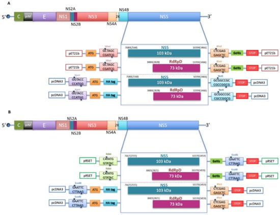 Schematic representation of the constructs used in this study. (A) WNV genome organization showing the polyprotein coding region (above) and the cloning strategy for the constructs used in this study (below). Two different inserts (NS5 and RdRp domain) were introduced into two different vectors, pET21b with the cloning sites for NheI (GCTAGC) and XhoI (CTCGAG) and a 6xHis tag, and pcDNA3 with the cloning sites for KpnI (GGTACC) and NotI (GCGGCCGC) and an HA tag in the N-terminus. Numbers indicate the positions of nucleotide and amino acid residues (in brackets) of the N-terminal and C-terminal ends of NS5 and RdRp domain. The numbering refers to WNV strain in wild birds in Serbia (GenBank accession number KC407673.1). (B) ZIKV genome organization showing the polyprotein coding region (above) and the cloning strategy for the constructs used in this study (below). Two different inserts (NS5 and RdRp domain) are introduced into two different vectors, pRSET with the cloning sites for NdeI (CATATG) and EcoRI (GAATTC), and a 6xHis tag, and pcDNA3 with the cloning sites for EcoRI (GAATTC) and XhoI (CTCGAG), and an HA tag in the N-terminal end. Numbers are referring to the positions of nucleotide and amino acid residues (in brackets) of the N-terminal and C-terminal ends of NS5 and RdRp domain. The numbering refers to ZIKV strain (GenBank accession number KX377337.1).