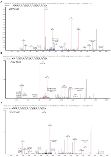 Identification of ZIKV (A), USUV (B), and WNV (C) NS5 phosphorylation sites. Spectra of the phosphopeptides identified by mass spectrometry analyses are shown. The position of the phosphorylated amino acid and the name of the protein analyzed are indicated in the upper left corner of each panel. The theoretical m/z of the phosphorylated peptides is shown, which in this case is 908.38. The theoretical m/z of the unphosphorylated peptides is 868.40. In addition, in each spectrum the series of fragments “y” (in red) and “b” (in blue) are shown, which justify the sequence assignment.
