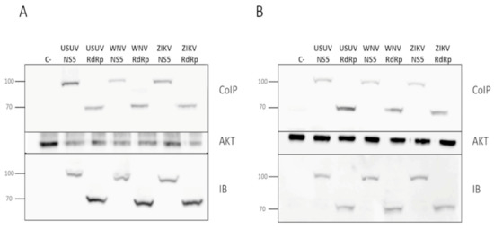 We have recently demonstrated that USUV NS5 colocalizes with Akt in a cellular context, and both proteins are pulled down together in Co-IP assays [11]. To elucidate whether ZIKV and WNV NS5 proteins interact with endogenous Akt in a live cell, we performed immunoprecipitation assays as those described above, using two different human cell lines. We confirmed that ZIKV and WNV NS5s also coprecipitate with endogenous Akt, independently of the cell line used (Figure 4).