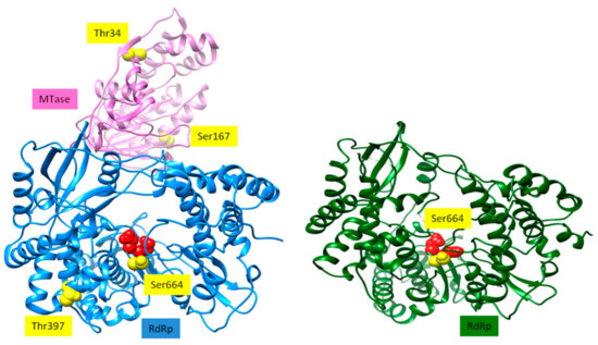 Structure of ZIKV NS5 [22] is shown as ribbons on the left. The MTase domain is shown in pink, and the RdRp domain is in blue. The two aspartates of the catalytic site are shown as red spheres. Sites that can potentially be phosphorylated by Akt/PKB are represented as yellow spheres. Structure of WNV RdRp domain [23] is depicted as ribbons. The two Asp residues of the catalytic site are shown as red spheres. The site that can be potentially phosphorylated by Akt/PKB is depicted as yellow spheres.