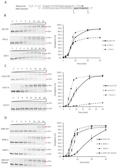 Polymerase activity tests to detect de novo activity was performed as previously described using an RNA substrate mimicking the 3′ end of USUV negative strand USUV20 (Table 1) [12].