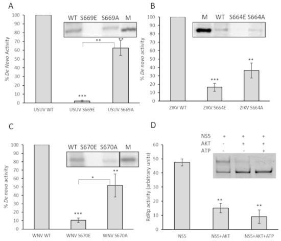 Effect on de novo polymerization activity of substitutions of the Ser located in the catalytic center of the domain. De novo activity of USUV NS5 Ser669 (A), ZIKV NS5 Ser664 (B), and WNV NS5 Ser670 (C) is shown. A total of 200 nM of each enzyme (WT or mutants) were tested as described in Materials and Methods. The graphs represent de novo RdRp activity of the indicated proteins normalized to WT. A representative experiment is shown on the top of each panel. Values shown correspond to the mean and SEM of at least three independent experiments. (D) Primer-extension activity of 400 nM wild-type WNV NS5 after 30 min of incubation at room temperature in the presence of active Akt/PKB. After incubation in the presence of Akt, the RNA polymerization reaction was initiated by adding nucleotides and fluorescent T/P. The reaction was allowed to proceed for 6 min at 35 °C. The graph represents relative primer-extension activity with respect to the total fluorescence detected in that sample (100%). A representative experiment is shown on the top of each panel. Values correspond to the mean and SEM of at least three independent experiments. Statistically significant differences (Student’s t-test) are represented as follows: * p < 0.05; ** p < 0.01; *** p < 0.001. Asterisks over the bar indicate the p-value compared to WT.
