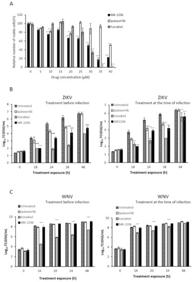 To analyze the antiviral effect of PI3K/AKT/mTOR inhibitors, cells were supplemented with 1 mL of media containing 1% FBS and 5–10 µM of ipatasertib, MK-2206, or honokiol in the conditions described in the text. All compounds were purchased from Selleckchem. Lineage 2 WNV strain WNV SRB Novi Sad/12 (GenBank accession number: KC407673) isolated from a dead goshawk in Serbia in 2012 [19], and ZIKV strain PRVABC59, isolated in Puerto Rico (ATCC reference number VR-1843) were used as previously described [20,21]. Vero cells were treated with in the presence (pretreated) or absence (not pretreated) of Akt drugs at the indicated concentrations in 24-well plates. After 5 h of incubation, ZIKV or WNV was inoculated at a multiplicity of infection (MOI) of 2 and virus adsorption was allowed for 1 h. Then, the cells were extensively washed to remove any unbound virus particles, and 1 mL of media containing 1% FBS and the corresponding Akt inhibitor was added to each well. Culture supernatant samples were collected at different post-inoculation times and titrated as previously described for ZIKV [20] and WNV [21].