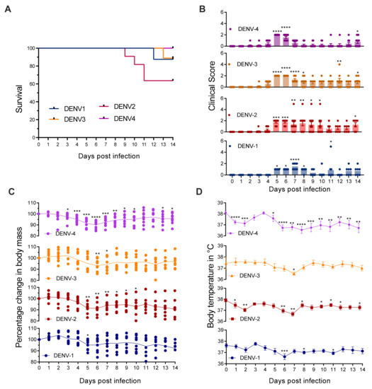 Mice (6–10 weeks old) were infected with 1 × 106 PFU DENV1-4 in 100 µL by intraperitoneal (i.p). injection (n = 8–9 per group) or 1 × 103 PFU of D2Y98P subcutaneously (s.c) (n = 5–10 per group). For immunization, 1 × 105 PFU of DENV1 were s.c. injected after 30 min ultraviolet light inactivation. The clinical symptoms were evaluated and scored as follows: 0—at healthy state, 1—signs of ruffled fur, 2—hunched back, 3—severe diarrhea, 4—moribund stage, 5—severe weight loss. Temperature was monitored daily using a rectal probe. For survival curves, mice were monitored daily for humane endpoints.