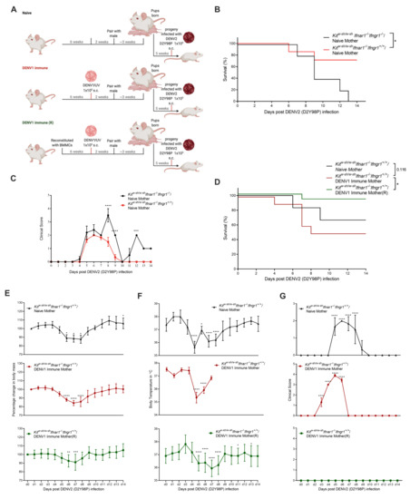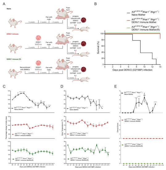 3.2. Progeny of DENV1 Immune KitW-sh/W-sh Ifnar1−/− Ifngr1−/− Mothers Are Protected from Subsequent Heterologous DENV2 Infection