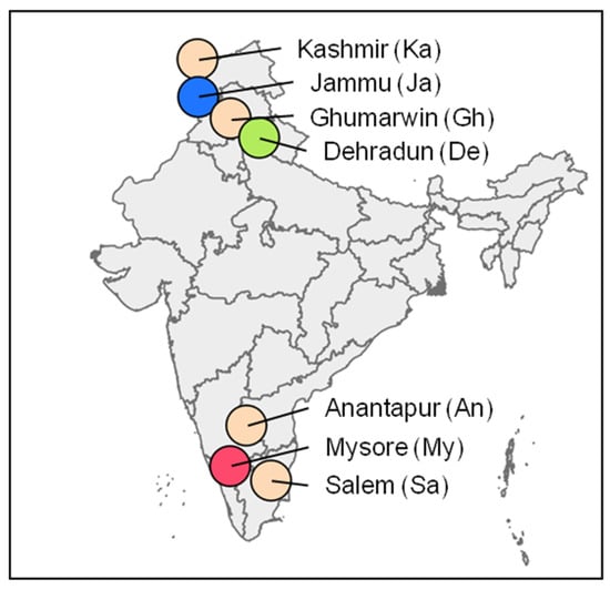 The virus samples used in this study were isolated from naturally field-infected B. mori larvae collected from different climatic regions of India: the temperate region of Kashmir (Ka), the subtropical areas of Jammu (Ja), Ghumarwin in Himachal Pradesh (Gh) and Dehradun in Uttarakhand (De), as well as the tropical locations of Mysore in Karnataka (My), Anantapur in Andhra Pradesh (An) and Salem in Tamil Nadu (Sa) (Figure 1, Table 1) []. Although the prevalence of BmNPV was found throughout the sericulture practicing areas of India, the selected locations were hot spots, where a heavy incidence of BmNPV was observed or reported. The extraction, purification and standardization of baculovirus occlusion bodies (OBs) was performed as described in Liang et al. [], with some modifications. In brief, B. mori larvae with symptoms of baculovirus infection, such as swollen intersegmental regions and liquification of the body, were collected individually in glass vials. The larval samples were combined with 1 mL 0.1% sodium dodecyl sulphate (SDS) and the cadavers were disrupted by using a pestle followed by vortexing for 2 min and filtration through three-layers muslin cloth. The suspension was centrifuged briefly at 100× g for 10 s to settle larger larval debris. The supernatant was carefully removed to a new centrifuge tube while the pellet was processed twice with an additional 0.1% SDS and above mentioned centrifugation steps. Then, all supernatants were combined and centrifuged at 15,000× g for 5 min using a Remi R-8C (Remi Group, Mumbai, India) centrifuge. The pellet was re-suspended in 1 mL distilled water and BmNPV OB samples from larvae of each location were named according to their sampling sites (Table 1). For the molecular studies, the genome sequence of BmNPV-India (GenBank accession no. JQ991010) was included []. This isolate originated from Nagpur (Central India) and was plaque purified in cell culture prior to its genome sequencing [].
