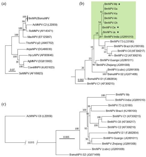 Maximum likelihood (ML) tree based on concatenated partial nucleotide sequences of polh, lef-8 and lef-9 of selected alphabaculoviruses (group I, clade Ia) [,]: (a) Various BmNPV and Bombyx mandarina nucleopolyhedrovirus (BomaNPV) isolates, Autographa californica nucleopolyhedrovirus C2 (AcMNPV-C2), Rachiplusia ou multiple nucleopolyhedrovirus (RoMNPV), Maruca vitrata nucleopolyhedrovirus (MaviNPV); Thysanopolusia orichalcea nucleopolyhedrovirus (ThorNPV), Antheraea pernyi nucleopolyhedrovirus (AnpeNPV), Hyphantria cunea nucleopolyhedrovirus (HycuNPV), Anticarsia gemmatalis multiple nucleopolyhedrovirus (AgMNPV), Condylorrhiza vestigialis nucleopolyhedrovirus (CoveNPV) and Spodoptera exigua multiple nucleopolyhedrovirus (SeMNPV). SeMNPV was set as outgroup; (b) Detailed view on the BmNPV and BomaNPV clade. Isolates originated from India are highlighted in green. The three isolates that were conducted for whole genome sequencing are marked by a star; (c) ML analysis based on a whole genome nucleotide alignment of the collinear genomes of isolates of the BmNPV and BomaNPV clade, as well as AcMNPV that served as outgroup. The robustness of the phylogenetic analysis was tested with 500 bootstrap replicates. GenBank accession numbers are given in brackets behind isolates’ names.
