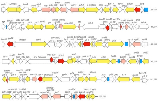 Schematic linearized presentation of the circular covalently closed dsDNA genome of BmNPV-My. Arrows indicate open reading frames (ORFs) and their direction of transcription. Gene names are given above each annotation. Per definition, polh (top left) is set as the first ORF in the genome of baculoviruses. Colors of ORFs indicate the similarity in amino acid sequence in comparison to BmNPV-India: white—identical amino acid sequence; yellow—99% to <100% identity; pink—98% to <99% identity; red—<98% identity. Blue boxes indicate homologous repeat regions (hrs).
