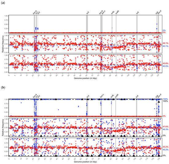 For isolate BmNPV-De, the median SNP frequencies of De + Ja and My + De + Ja were ƒ = 48.1% and ƒ = 40.1%, respectively (Figure 4a, middle). Similar median SNP frequencies were measured for isolate BmNPV-Ja, where the De + Ja and My + De + Ja variable SNP positions had alternative nucleotide frequencies of ƒ = 45.8% and ƒ = 40.5%, respectively (Figure 4a, bottom). In comparison to BmNPV-My, the isolates BmNPV-De and BmNPV-Ja appeared more variable in their SNP frequencies, indicating high levels of genotypic heterogeneity. Accumulating SNP positions were detected in genomic regions bro-a, bro-b, bro-c, bro-d and hr1 to hr6 (Figure 4a, middle and bottom). The homogeneity of isolate BmNPV-My was further confirmed by the mapping of reads against reference BmNPV-India (Figure 4b). Since the reference was not based on one of the sequenced BmNPV samples, the identification and determination of solely BmNPV-My specific SNP positions (n = 18; ƒ = 100%) was possible (Figure 4a, top). The My + De + Ja specific SNPs further supported the purity of BmNPV-My (n = 631; ƒ = 100%) representing the difference of all three sequenced samples to the reference. For isolate BmNPV-De the median frequencies of De + Ja (ƒ = 47.6%; n = 1113) and My + De + Ja (ƒ = 46.3%, n = 631) specific SNP positions were similar to the BmNPV-My reference-based analysis, supporting the assumption of two major genotypes. An increased genetic variability was also visible in bro-a, bro-b, bro-c, bro-d and hr1 to hr6 (Figure 4b). Based on both references, a drop of SNP frequencies below the medians was visible in regions around 5 kb, as well as 80 to 95 kb (Figure 4a,b).