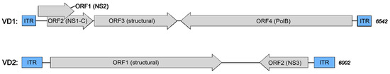 Bipartite linear ssDNA genome of BmBDV-Ja. The length of genome segments VD1 (top) and VD2 (bottom) are given in nucleotides (nt). Gray arrows indicate annotated ORFs and their orientations. Inverted terminal repeats (ITR) are marked in blue.