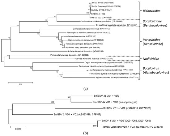(a) Maximum likelihood tree based on the NS3 protein sequences and homologs in selected virus families []. (b) Maximum likelihood tree of the concatenated bipartite (VD1 and VD2) genome of Bombyx mori bidensoviruses. VD1, spacer and VD2 genome were used further for SNP detection analysis (see Figure 7). The BmBDV-Ja (minor genotype) sequence reflects the consensus sequence of BmBDV-Ja, including all alternative nucleotides with frequencies ƒ > 10% in variable SNP positions that were detected in the BmBDV-Ja based SNP analysis. BmBDV—Indian isolate; BmBDV 2—Yamanashi isolate; BmDV 3—China isolate; BmDV Zhejiang—Zhenjiang isolate. GenBank accession numbers are given in brackets behind virus names or abbreviations.