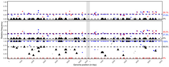 Common reference-based SNP detection method using BmBDV-Ja VD1 (left: 1 to 6542 nt) and BmBDV-Ja VD2 (right: 1 to 6002 nt), concatenated with a random 300 nt spacer (light grey vertical box). The entity of sequenced reads of the BmNPV-Ja (top), BmNPV-De (middle) and BmNPV-My (bottom) samples were used for mapping on the concatenated reference and the detection of bidensovirus reads. The SNP detection, specificity determination and frequency calculation were performed identically, as described for BmNPV (Figure 4). Refer to the Materials and Methods section for further details. Black triangles: solely BmBDV-My specific; red: BmBDV-De and BmBDV-Ja specific; blue: BmBDV-My, BmBDV-De and BmBDV-Ja specific; light grey dots: either BmBDV-My + BmBDV-De or BmBDV-My + BmBDV-Ja specific SNP positions. Median SNP frequencies are presented by black (=BmBDV-My), blue (=BmBDV-De and BmBDV-Ja) and red (=BmBDV-My, BmBDV-De and BmBDV-Ja) dashed lines. Medians are given to the right of the plot in corresponding colors.
