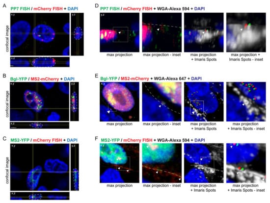 In the first experiment, we used two distinct sets of smFISH probes complementary to either the inserted noncoding mCherry sequence, in which the initiator AUG codon was deleted (pRC.GagCFP.ATG-mCherry), or a cassette encoding 24-copies of the PP7 RNA binding stem-loops (pRC.GagCFP.PP7) (Figure 1A) [48,58]. In the second approach, we used a set of smFISH probes targeting the noncoding mCherry RNA sequence in pRC.GagCFP.ATG-mCherry and co-expressed pRC.GagCFP.MS2, which has 24 tandem repeats of the MS2 RNA stem-loops [47], with a plasmid encoding MS2-YFP-NLS to label the unspliced vRNA (Figure 1B). The third set of experiments used two distinct RNA-loop binding aptamers: 24 copies of the MS2 RNA stem-loops in pRC.GagCFP.MS2 or 18 copies of the Bgl RNA sequence in pRC.GagCFP.Bgl, which were co-expressed with pMS2-mCherry-NLS and pBgl-YFP-NLS (Figure 1C) [30,47] to visualize two distinct RSV unspliced vRNA populations.