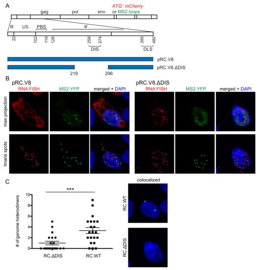 In RSV, base-pairing between two DIS sequences on interacting genomes allows for the formation of a genomic RNA dimer [18,59]. Our laboratory and others previously demonstrated that deletion of the DIS sequence results in reduced genomic RNA dimers in vitro [2,17,60]. Therefore, we sought to examine the importance of the DIS in the formation of genomic RNA heterodimers in vivo using our genomic RNA visualization methods. We compared a full-length proviral construct (pRC.V8) with a proviral construct containing a deleted DIS (pRC.V8.ΔDIS); in each construct, a noncoding ATG-mCherry RNA sequence or a cassette of 24 copies of MS2 stem-loops was inserted into the intron to label unspliced vRNA (Figure 3A). Using a combination of mCherry RNA smFISH and MS2 coat protein RNA labeling methods, we used confocal microscopy to determine whether heterodimer formation in cells was dependent on the presence of the DIS (Figure 3).